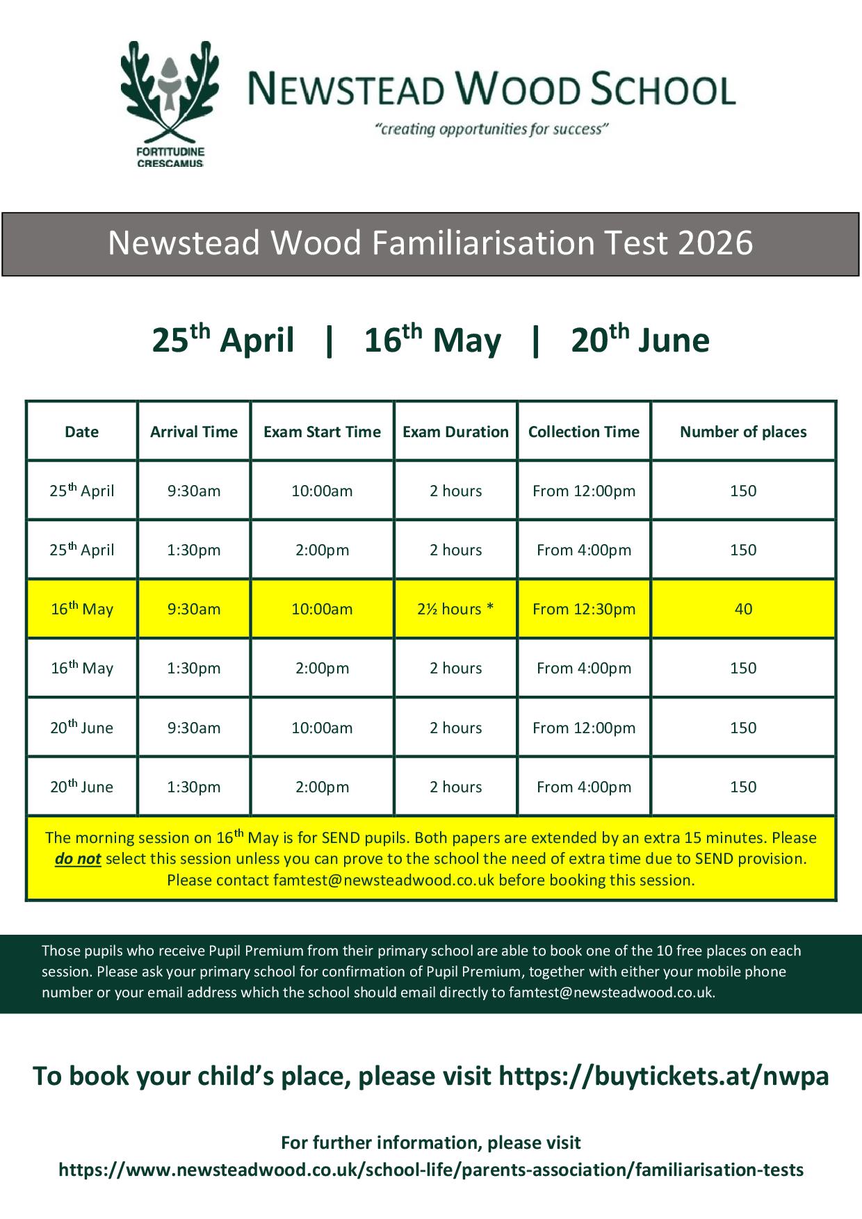 The Familiarisation Tests at Newstead Wood School are being organised and run exclusively by the Newstead Wood Parents Association (NWPA). Therefore, any queries about Familiarisation Tests should be directed to famtest@newsteadwood.co.uk, not to the school. We aim to reply within a week.